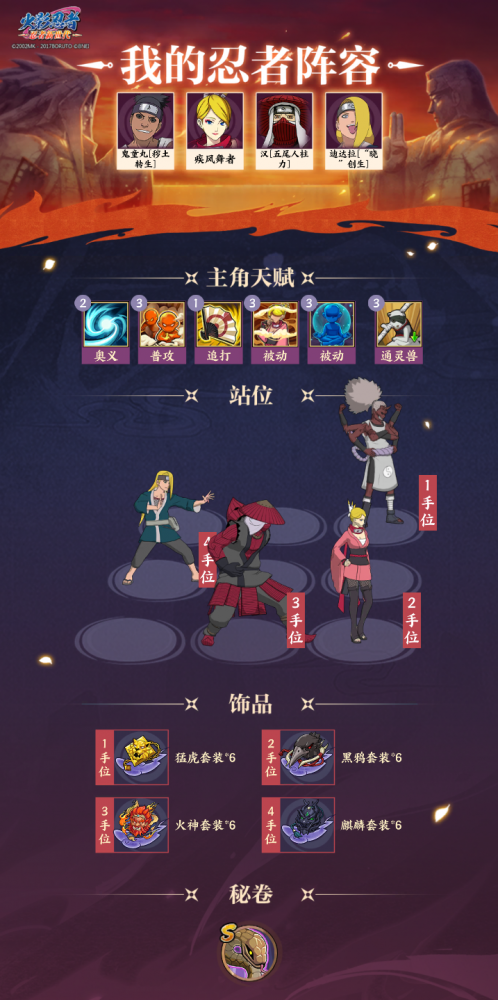 搭配思路:可以使用奥义伤害系数较高或具有养成能力的忍者。