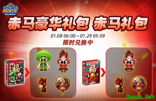 《跑跑卡丁车》2026新年礼包”赤马豪华礼包“、”赤马礼包“现已登场!在1月8日06:00至1月29日05:59期间兑换”赤马豪华礼包“可获得”葱头(无限制)”、“葱头赤马装(无限制)”、“迷你赤马(无限制)”、“赤马气球(30个)”;而在同时段内兑换“赤马礼包”则可获得“葱头赤马装(无限制)”、“迷你赤马(无限制)”、“赤马气球(30个)”~