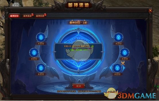 完成任务封印兽神封印,可增强对兽神BOSS的伤害、免疫兽神的特殊攻击;提高封印阶数可以挑战更高阶数的兽神BOSS,还可永久获得卓越一击、会心一击伤害加成。