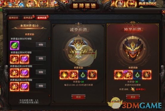 每日13:00~13:59分可进入兽神遗迹中进行祈愿。祈愿可获得人杰魂、兽神首饰碎片、兽魂石、兽神装备等奖励。使用兽神酒进行神圣祈愿,可在任何时间进行祈愿,并获得更为丰厚的祈愿奖励。每周达到一定祈愿值还可获得丰厚的祈愿奖励