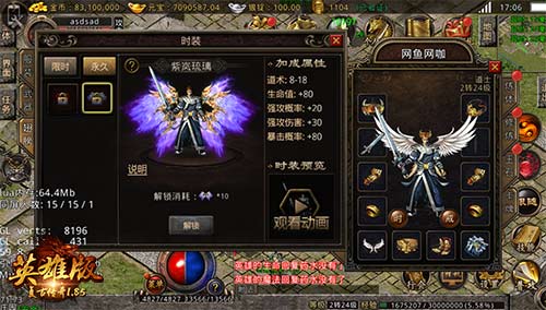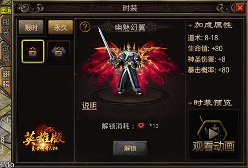 除了翅膀外,《复古传奇英雄版》还有特色的翅膀时装,此次更新新增翅膀时装紫岚琉璃和幽魅幻翼,不仅可以提升角色的整体属性,其酷炫的外观、绚丽的特效更能凸显角色的潇洒帅气。翅膀时装在角色面板时装界面内进入,同其他类型时装,自带属性,并与当前装备翅膀属性共存,可以进行升星,增加其属性。翅膀时装给角色提供华丽的翅膀展现,让你无论走到哪里,都是令人为之侧目的焦点!