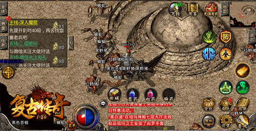 祖玛寺庙坐落于盟重省沙漠的极北之地,是祖玛族不可侵犯的圣地,是传奇玩家无法忘记的存在。祖玛寺庙里怪物密集,刷怪升级快,其中祖玛教主是该地图的大BOSS,击败它有几率掉落极品装备和技能书。