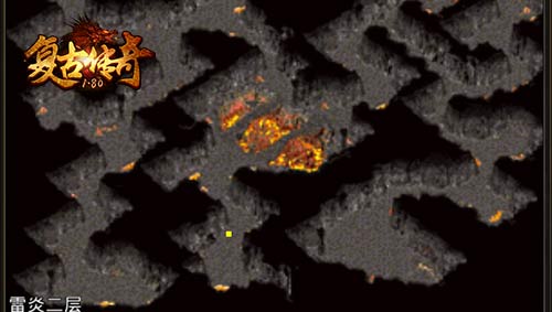 雷炎洞穴是此次新增的地图,一共有2层,当服务器达到一定等级后开启。可以通过盟重公告牌或飞鞋传送进入,进入雷炎洞穴后,可以通过雷炎使者和洞穴探险者直接传送到雷炎二层进行探险。迷宫一般的地图,遍布着岩石、焦土和岩浆,蜘蛛形状的怪物占据着这片地域,被蜘蛛啃食过的尸骨随处可见,令人不寒而栗。