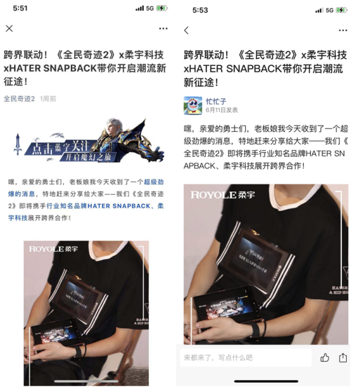 全民奇迹2官方微信&游戏圈发布与柔宇科技跨界信息