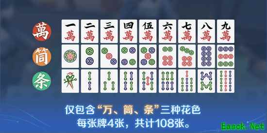 麻将规则与四川麻将一致:牌库仅包含“万、筒、条”三种花色,每张牌4张,共计108张。每场对局中,一家胡牌不会结束游戏,直到三家胡牌或者牌堆耗尽。对局开始时,依次进行“换三张”——选择3张同花色的手牌,按逆时针顺序进行交换、“定缺牌”——选择1门花色作为本局缺门,胡牌时手牌中不能含有此花色的牌。对局过程中,只能碰、杠,不能吃。杠牌后会立即结算流水。