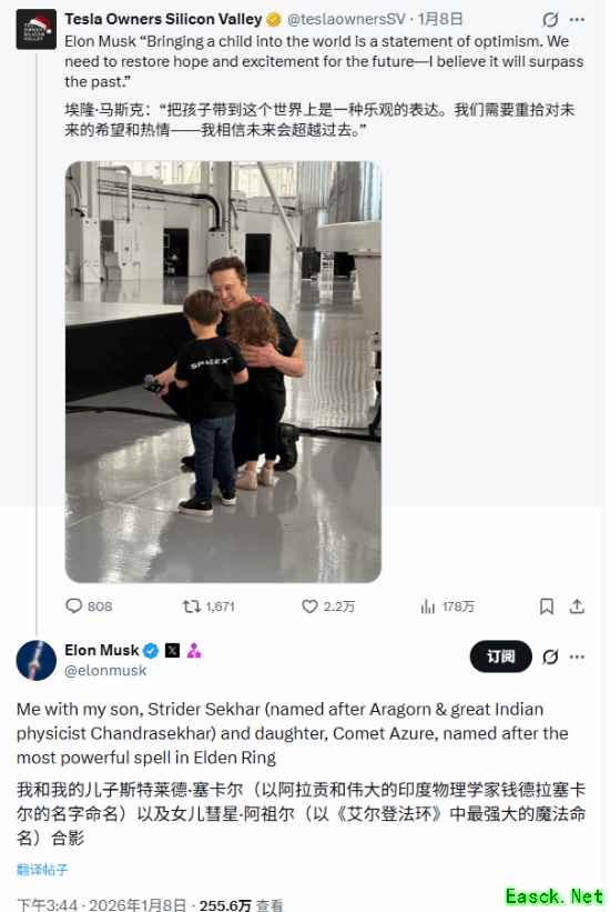 近日,马斯克在社交平台回复了一张与孩子合影的照片,解释了他们名字的由来:儿子取名灵感来自《指环王》和著名物理学家,女儿则直接致敬了《艾尔登法环》中最强法术之一:彗星亚兹勒(Comet Azure)。而这个新奇的名字很快引发了网友热议。