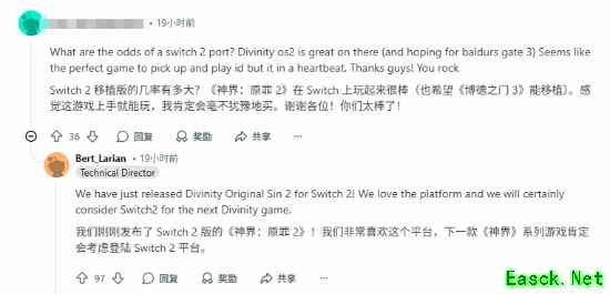 在活动中,有玩家提问:上个月于TGA上公布的《神界》新作,是否有机会登陆 Switch 2。对此,Larian 的技术总监(Reddit账号是 u/Bert_Larian)回应称,工作室不久前刚刚将《神界:原罪2》带到了任天堂最新主机上,因此他们毫无疑问会将 Switch 2 纳入《神界》新作的考虑平台之中。
