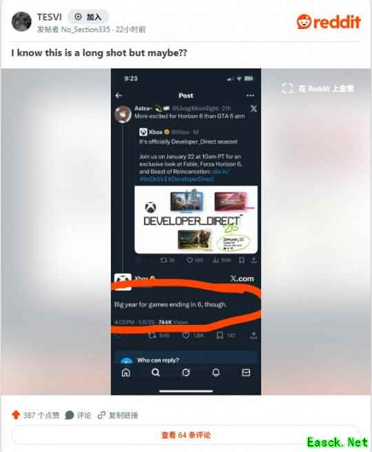 在X上,一名用户@UsagiMoonlight转发了Xbox关于以上消息的推文,并回复道:“我现在更期待《极限竞速:地平线6》而不是《GTA6》。”Xbox则回复说:“今年确实有很多以6结尾的游戏。”