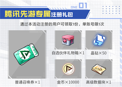 活动期间通过活动页面首次注册的用户,即可领取普通召唤券、自选伙伴礼物箱、晶钻、金币、高级数据块等丰富礼品!
