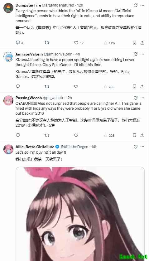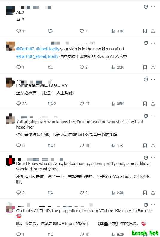 此前游民曾报道,《堡垒之夜》官方推特发文,将与虚拟主播绊爱联动。而随着活动消息的放出,一些对绊爱不太了解的外网玩家又因其英文名字(Kizuna AI)中的“AI”陷入误解。