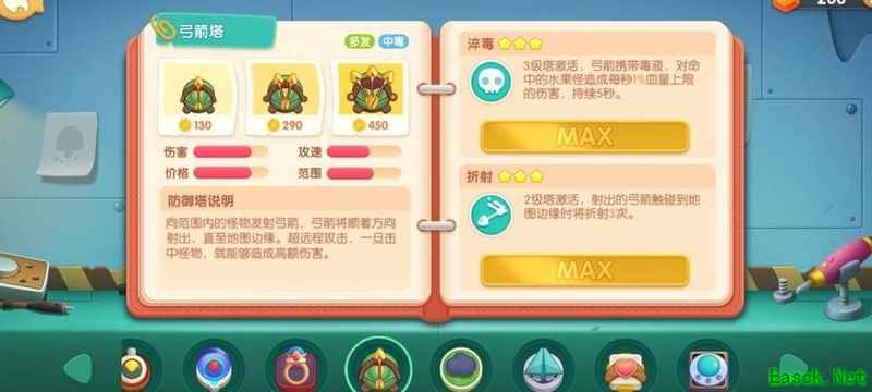 从怪物出口处开始,优先建造弓箭塔。弓箭塔升至三级并搭配毒液后具备持续伤害能力,攻击范围广阔,既能覆盖出怪口,又能兼顾糖果区域,实现双重防护。