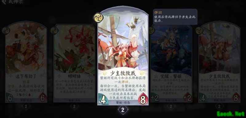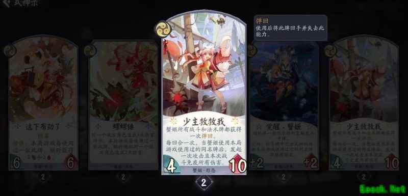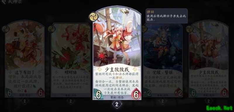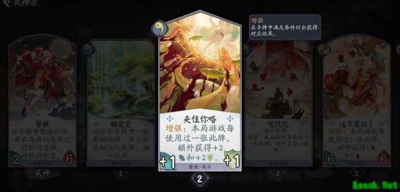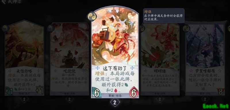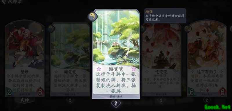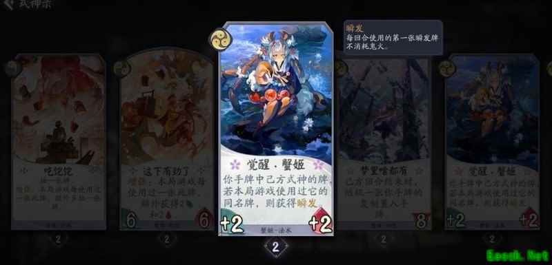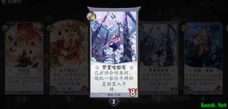 己方回合结束时稳定获得一张手牌,复制内容包含其他式神的卡牌,除觉醒和形态外均不亏。战斗牌与法术牌皆为场面资源,若复制到蟹姬自身卡牌,可直接在手中触发双倍强化效果,大幅提升节奏,该幻境机制实用性强,操作流畅。