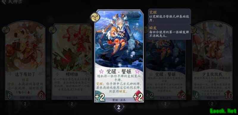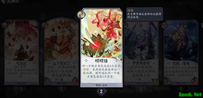这张牌初始为+1+1战斗牌,一勾阶段表现尚可,第二张升级为瞬发+3+2,强度显著提升。蟹姬otk核心依赖此卡,整体削弱影响较小,依然具备较强竞争力。