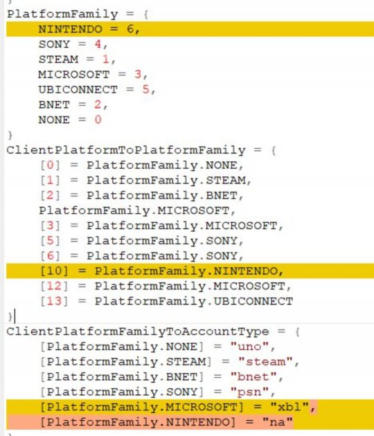 据数据挖掘者“RealityUK”在社交媒体上发布的发现,在启动器代码中,“Nintendo”已与索尼(PlayStation)、Steam、微软(Xbox)以及战网(BNET)并列,被列为可选的平台标识之一。这一更新引发了玩家社区的广泛关注。