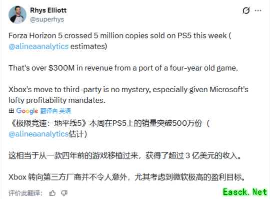“这意味着,一款已发行四年的游戏通过移植创造了超过3亿美元的收入,”埃利奥特表示,“Xbox转向第三方发行策略已不再是个谜,尤其是在微软追求高额利润的要求下。” 《极限竞速:地平线5》自发行起便保持高人气(首周玩家数超过1000万),加之开发团队持续提供新内容和功能,其PS5版本的成功在情理之中。