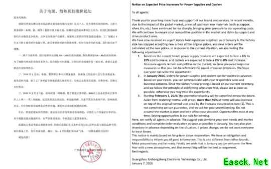 信中指出,电源价格将上涨6%至10%,CPU散热器价格将上涨约6%至8%。该公司已敦促合作伙伴立即下单,以避免价格上涨的风险。