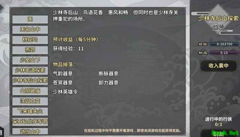右上角的挂机系统可获取经验和物品,以物品为主。挂机掉落的物品点击后可查看,目前我正在挂长白。