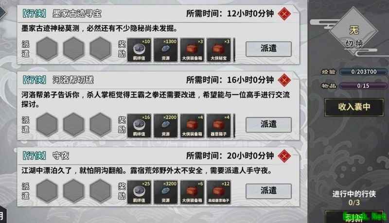 行侠任务分为12小时、16小时和20小时三种时长,每次最多可派遣三名侠客参与。与以往不同,当前版本中多次派遣不会缩短行侠所需时间。