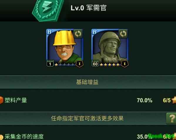 通过委任中心配置军官可获得强力增益效果。例如,军需官提升塑料产量,工兵长增强涂料产出、部队负重及资源采集效率,审计官则提高电能与金属的产量和使用效率。对于初期资源紧张的新手玩家,优先安排这些军官到指挥岗位,能显著改善资源状况,助力基地快速发展,是前期运营的关键策略之一。