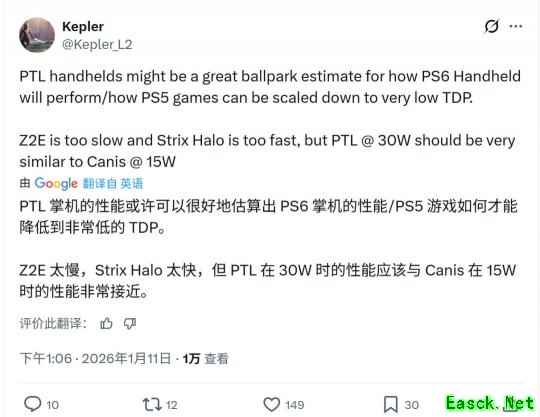爆料者Kepler_L2表示,将PS6P与现有芯片对比,你会发现搭载AMD Ryzen Z2 Extreme的Strix Point性能偏弱,而AMD最新的Strix Halo则明显过强,反而是CES 2026上亮相的英特尔Panther Lake更具参考价值。