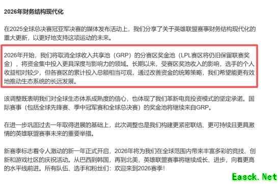 近日,拳头将于2026年开始取消LEC 、LCK、LCS分摊奖金池,LPL赛区将仍旧保留联赛奖金),官方表示将资金重新分配用于发展“长期”生态系统。