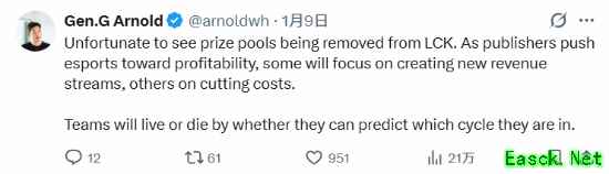GEN的CEO阿诺德发文表示:“很遗憾看到LCK取消了奖金池。随着发行商将电竞行业推向盈利化,有些会着力开拓新的收入来源,有些则选择削减成本。而队伍能否生存,将取决于他们能否准确判断自己正处在行业的哪个周期之中。”