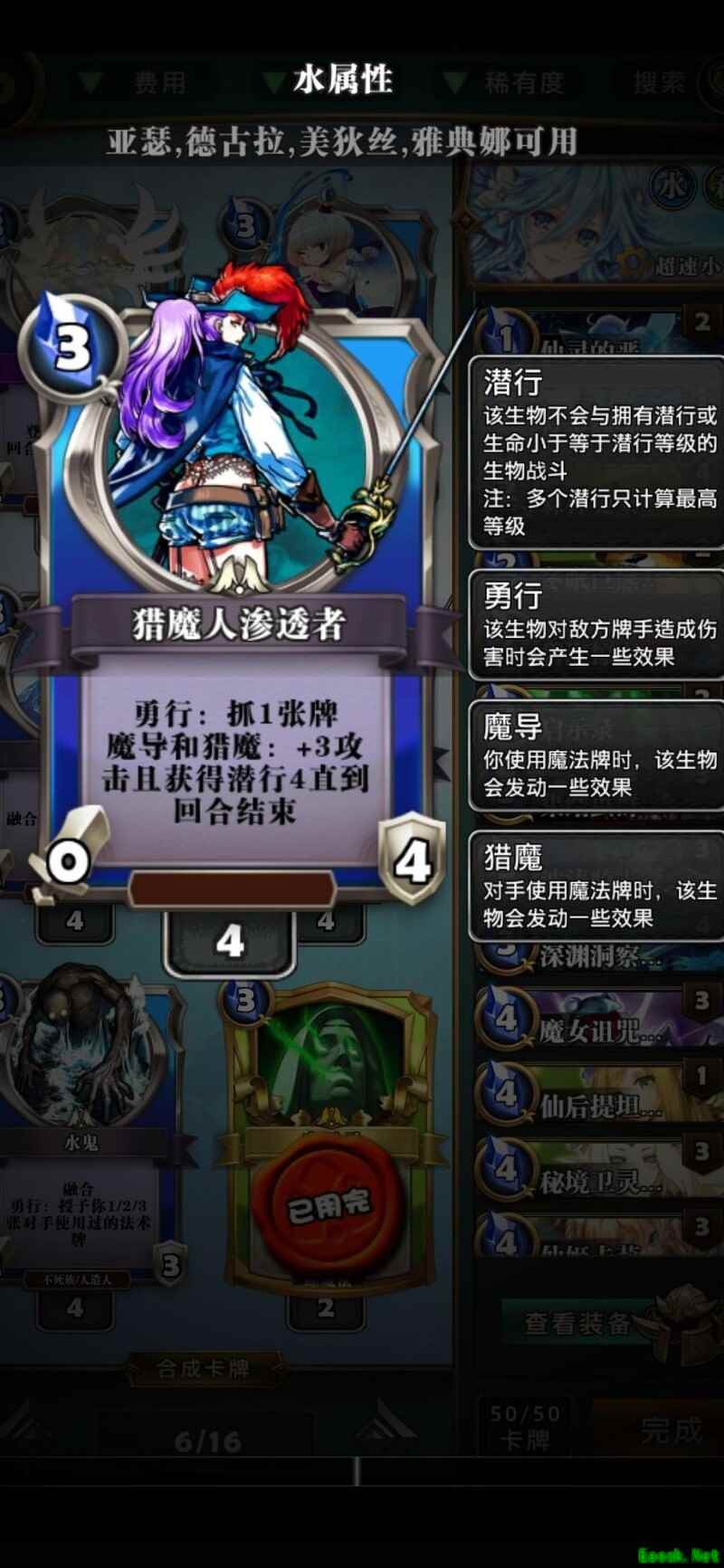 猎魔人渗透者是蓝色职业中极为常见的选择,其潜行4的效果广受认可。虽然该卡组也可考虑投入,但因其为蓝色,无法享受绿色增益带来的攻防提升,启动受限。此外,在劣势对局中易被轻易解掉或遭潜行单位绕后打击。如今已有更低费高效的波涛骑士,故暂不将其纳入构筑。