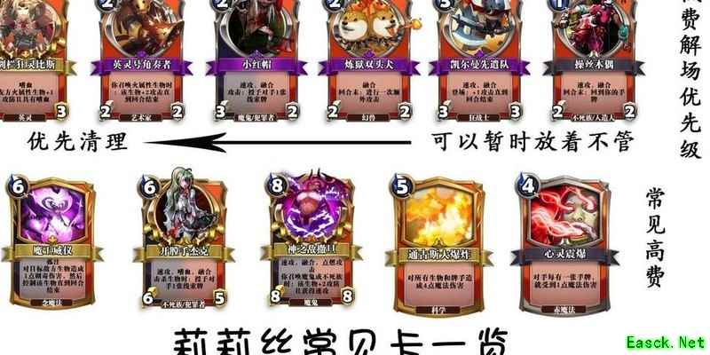 偏向采用铺场策略,利用熊、波涛骑士和虫群构筑防线,形成密集的前排阵型。类似于保卫萝卜的塔防思路,需兼顾三条路线的防守与调度。前期优先选择3费生物铺场而非盲目跳费,除非能确保在5费时稳定拍下春之仙女等强力单位,否则容易被小红帽类卡牌通过爆牌压制。解场优先级可参考此前图示,在预判对手走位时,应重点关注关键单位的移动路径。例如号角类单位虽自身属性较弱,但能提供高额攻击加成,若存活将带来更大威胁。面对中速莉莉丝时,需警惕其可能在中期使用通古斯大爆炸进行全场清除,因此尽量使己方生物血量保持在5点以上,以提升生存能力。