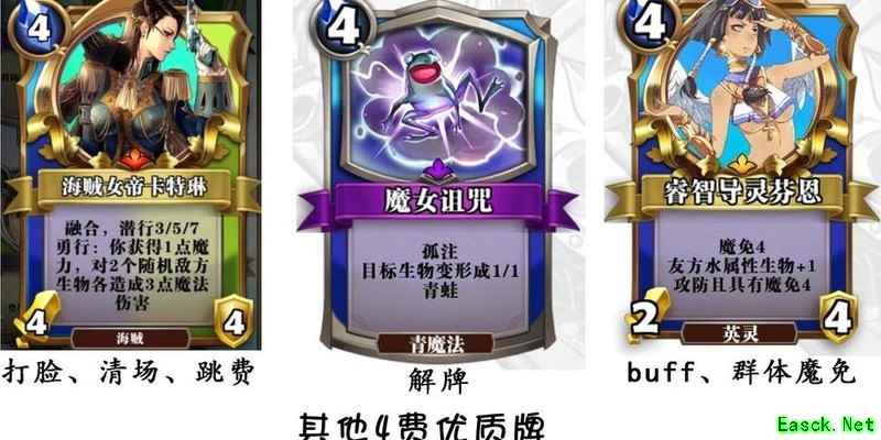 四费卡介绍完毕。因人鱼跳费机制特殊,四费卡不宜携带过多,多为功能性选择。若起手牌较为平滑,如含史莱姆及二、三费牌,可保留;若已有跳费组件,则无需保留四费卡。