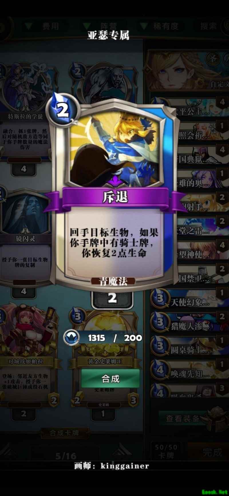 亚瑟常带的卡牌拥有白色专属异能不朽,看似棘手,实则有应对之法。绿色对应的能力并非嗜血,而是再生。由于不朽多在一回合内生效,只要用绿色生物抵挡伤害,再借助再生效果,下回合即可恢复战力。因此,具备此特性的秘境卫灵极为实用,建议尽快集齐四张以应对此类局面。