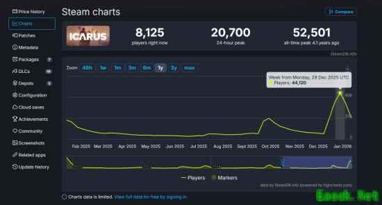 游戏从原价35美元直接降到了3.50美元(国区12.8元),这一招直接让游戏的日活爆了。根据SteamDB数据,游戏在12月的同时在线人数峰值飙升至44,120 人(11月仅为9000人)。这是除2021年12月首发以外的历史最高记录。