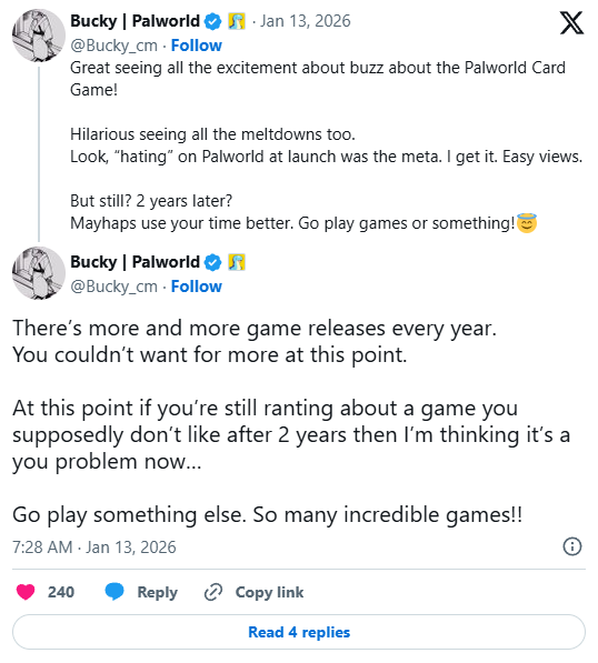 他进一步表示:“听着,在游戏发售时抨击《幻兽帕鲁》曾是种潮流。我懂,这能轻松赚取流量。但现在呢?两年过去了?或许你该更好地利用时间。去玩点游戏或做点别的吧!”
