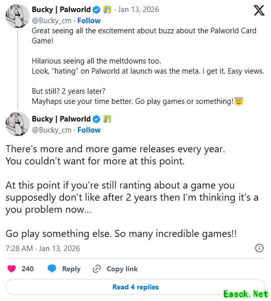 他进一步表示:“听着,在游戏发售时抨击《幻兽帕鲁》曾是种潮流。我懂,这能轻松赚取流量。但现在呢?两年过去了?或许你该更好地利用时间。去玩点游戏或做点别的吧!”