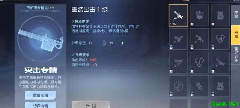专精分为突击、爆破、辅助和狙击四类,玩家只能选择其一进行后续解锁,也可花费银币重置。选定后可开启该专精下的各项内容,并通过消耗专精点与银币提升等级。需注意的是,专精效果仅对重武器生效,合理选择有助于发挥战斗优势。