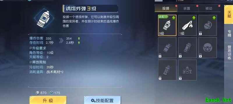 玩家可同时装备一个投掷技能和一个装置技能,被动技能则可全部生效。技能解锁需消耗银币与天赋点,后者可通过参与日常活动或完成据点挑战获取。
