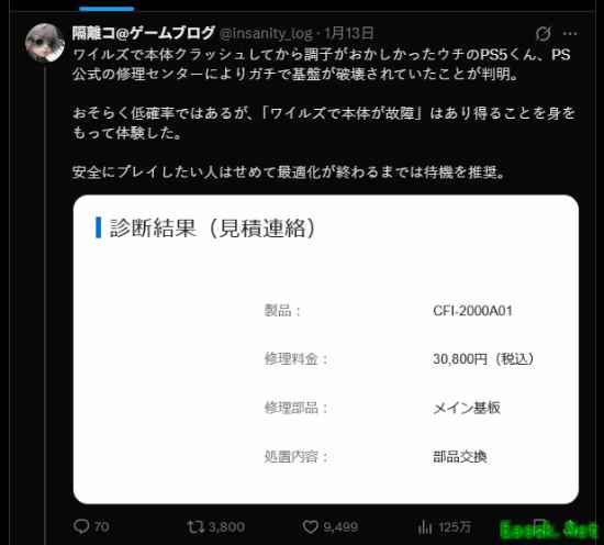 近日,日本网友隔離コ@ゲームブログ分享其PS5疑似因运行《怪物猎人:荒野》出现严重故障的经历引发玩家关注。