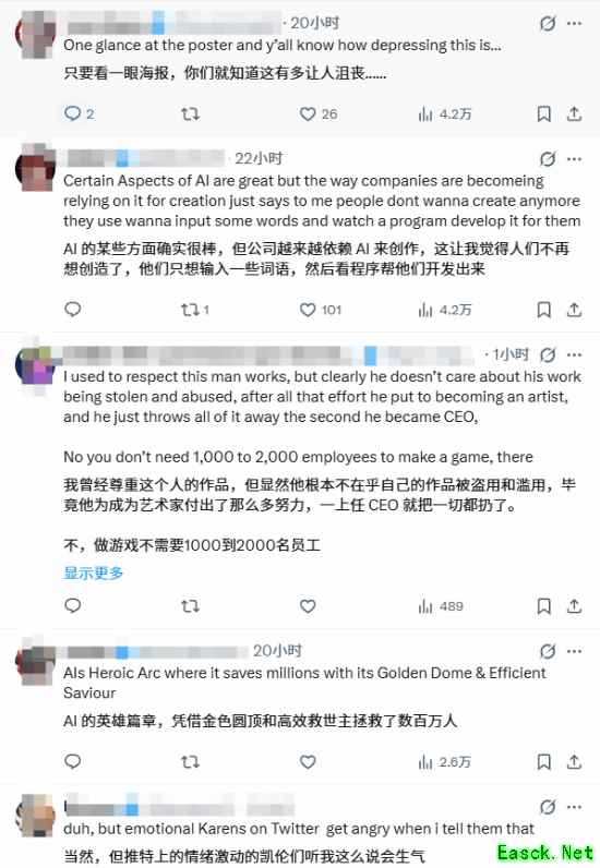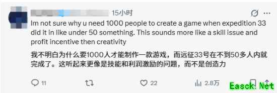 该言论发布后,多位玩家在社交平台表达了不同观点:有玩家指出,《远征 33 号》等游戏仅需不到 50 人即可完成开发,认为这一现象更倾向于 “技能与利润激励问题,而非创造力不足”;也有玩家认为 AI 虽有优势,但企业过度依赖 AI 创作,反映出 “人们不再想主动创造,仅希望通过输入指令让程序完成开发”;还有玩家表示,曾认可金亨泰作为创作者的作品,但如今其作为 CEO 的言论,体现出对作品原创性的忽视,同时质疑 “开发游戏无需 1000-2000 人的规模”。