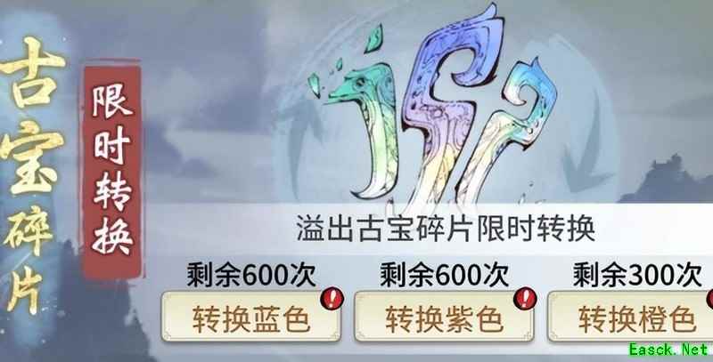 古宝升至五星后,多余碎片将自动转化为古宝碎片。可消耗任意品质碎片兑换指定碎片,各类兑换均有次数限制。使用紫色或橙色碎片可按特定比例转换为蓝色碎片,转换数量有限,具体比例如下所示。