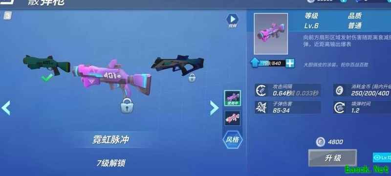 普通品质子弹,近距离伤害可达85,远距离为34,攻击间隔0.7秒并随升级缩短,填弹耗时1.2秒,升级费用分别为250、200、400金币。