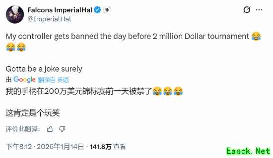 ImperialHal在社交媒体上发文称:“在一场200万美元奖金的比赛前一天,我的手柄被禁了。这肯定是在开玩笑吧。”