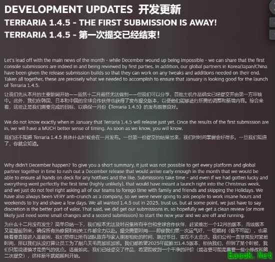各位泰拉人们,可以开始倒数了!今日,开发商Re-Logic正式宣布:备受期待的《泰拉瑞亚》1.4.5版本将于1月27日正式上线。