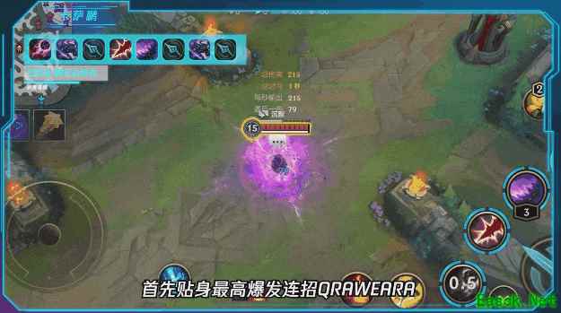 卡萨丁拥有三级R技能后,可打出极致爆发连招:贴近目标后使用Q接R、A、W、E、R、A(14A23A4A),全程两次释放R技能。此连招伤害极高,尤其在敌人近身或探草时瞬间爆发,堪称毁灭性打击,操作流畅时能迅速斩杀对手。