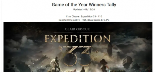 根据ResetEra论坛用户整理的更新数据,截至2026年初,《光与影:33号远征队》在本年度已累计获得410个“年度游戏”奖项。这一成绩使其超越了获得326个奖项的《最后的生还者 第二部》,跃居历史排行榜第二位。