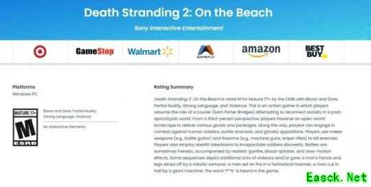 我们曾报道过,娱乐软件分级委员会(ESRB)曾一度删除《死亡搁浅2:冥滩之上》的PC版评级界面,让玩家们一度以为本作将无缘PC平台。如今,ESRB平台又重新发布了针对PC平台的评级,让粉丝们的悬着的心终于可以落地了。