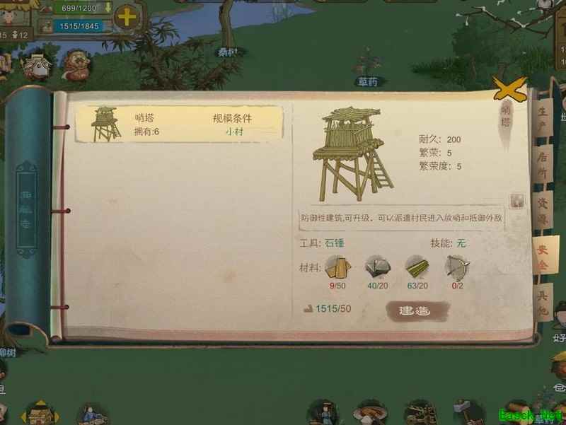 在建筑上设置哨塔,可有效应对饥寒与外敌威胁。随后优先建造石舂,开垦旱地种植作物,再兴建仓库储备物资。一切就绪后便可外出探索、招募人员。之后便可依个人喜好,逐步建设理想中的世外桃源。
