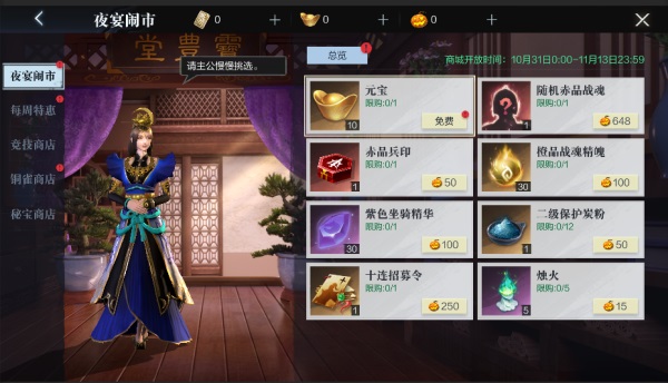在各位小霸王紧锣密鼓完成任务,筹备物资的同时,夜宴闹市也将火热开启,在闹市商店,可以使用物资筹备活动中获取的南瓜灯的兑换各种稀有道具,不仅有橙品战魂精魄,保护碳粉等稀有材料,更有赤品兵印,赤品战魂等平时难以获得的战力提升道具。