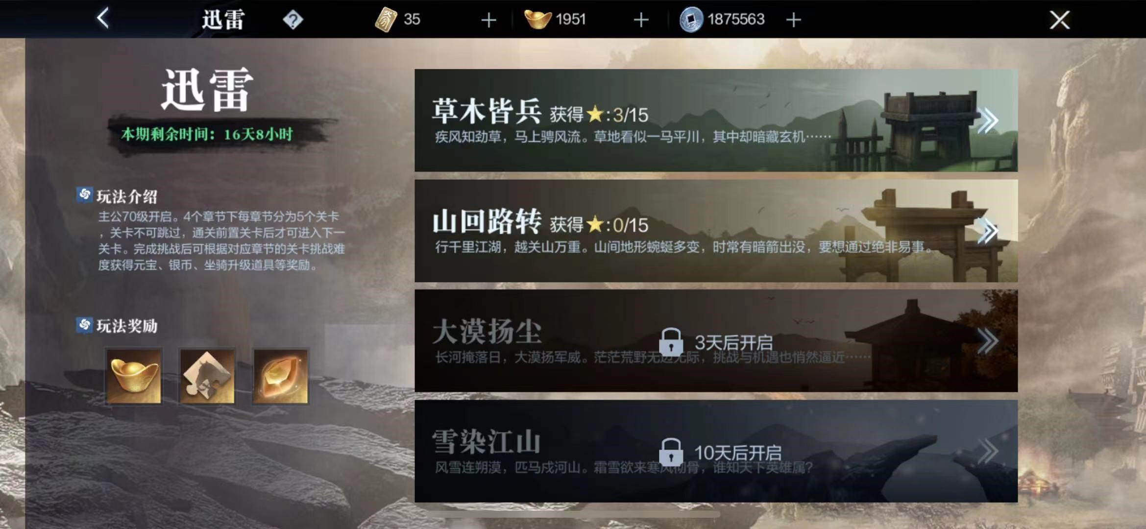 在迅雷玩法中,玩家可以与战马一起上阵破敌,获得丰厚的奖励。该玩法开启后,每四周为一个赛季,且每周开放一个章节,每个章节下有5个关卡。目前共有四大地图:草木皆兵、山回路中、大漠扬尘以及雪染江山,可供玩家进行挑战。