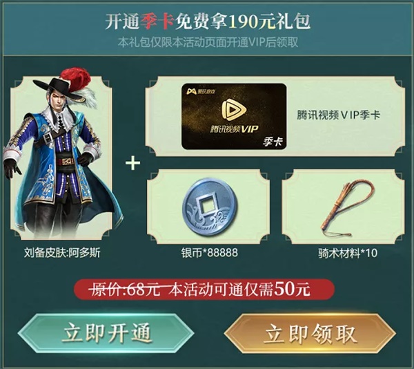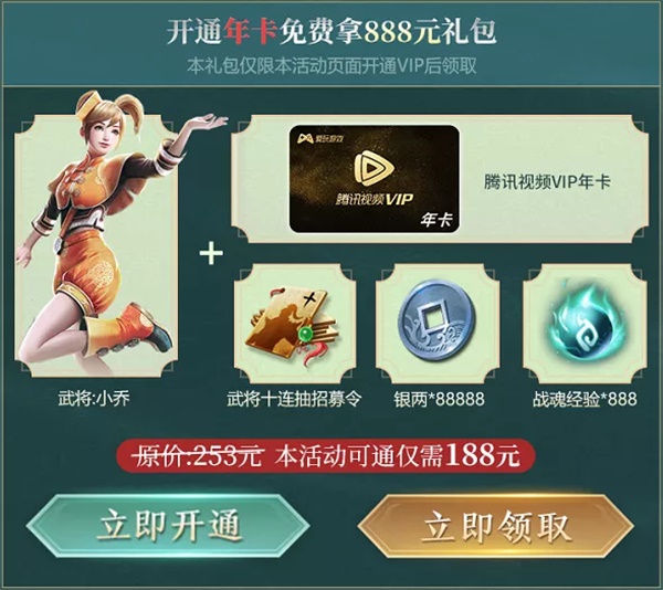 1、活动期间在指定页面新开通腾讯视频VIP,即可获得真三国无双霸手游专属礼包,套餐道具每个账号仅可获取一次,请使用游戏角色对应的QQ/微信账号开通。
