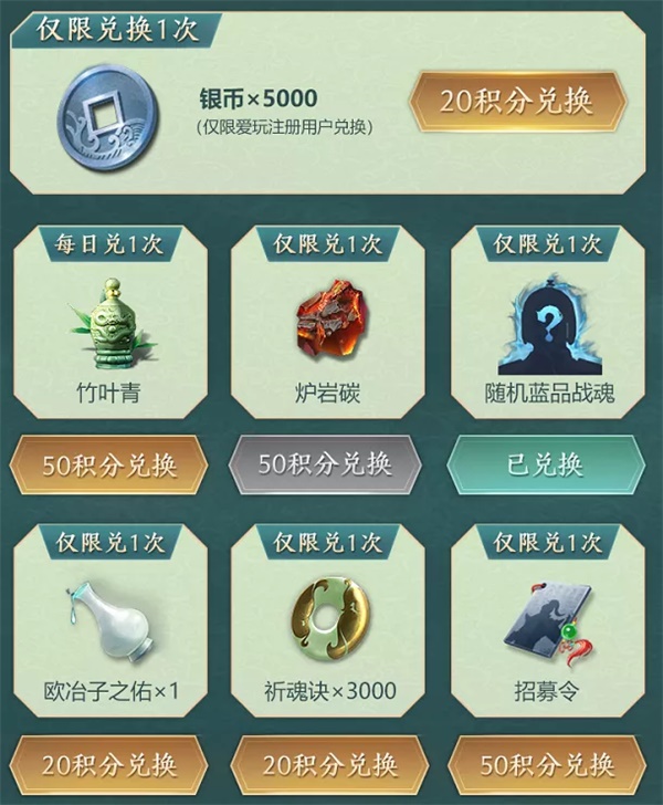 武将皮肤、银币、招募令、祈魂决、欧冶子之佑、竹叶青、炉岩碳、随机蓝色战魂、武将十连抽招募令、战魂经验等。