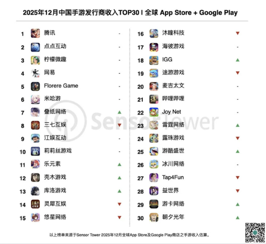 日前根据美国资深全球移动应用数据分析公司Sensor Tower的最新报告显示,2025年12月世界手游市场最新销量排行中,来自中国的手游合计占据34.6%份额,根据世界各国之首。